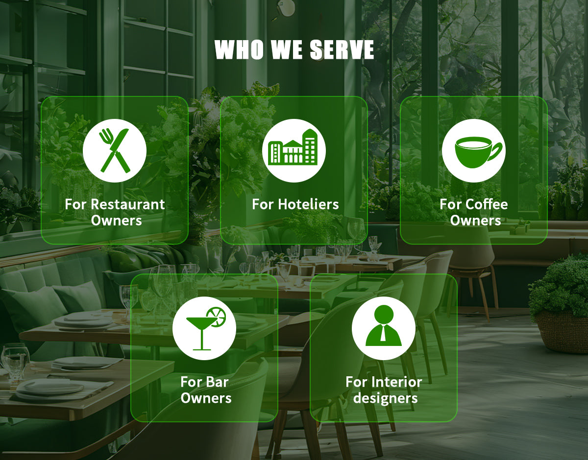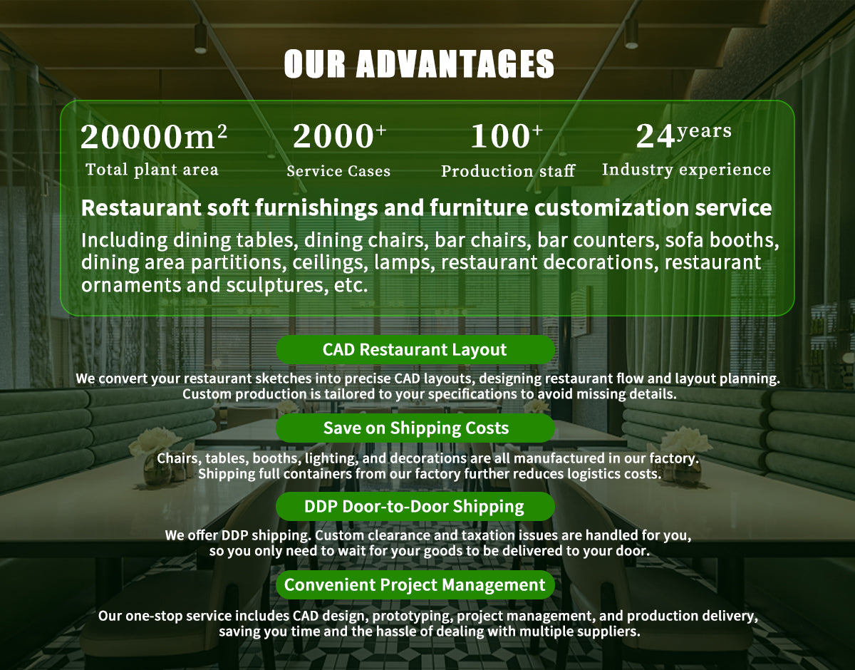 Our factory covers an area of 20,000 square meters and is fully equipped with various production equipment. We use high-quality materials and advanced craftsmanship to ensure product quality and comfort. We also prioritize environmental protection, ensuring that the production process does not cause pollution. At our factory, you can customize all your restaurant-related furniture and decorative materials. Our products have been exported to many countries and regions in the world, especially the United States and Europe (France, Germany, the United Kingdom, the Netherlands, etc.). Our products have won a good reputation among customers. We welcome customers from all over the world to contact us for cooperation.