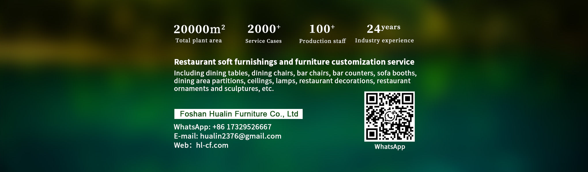 Hello, we are Foshan Hualin Furniture Co., Ltd. from China. We specialize in the production of various commercial furniture products, including dining tables, dining chairs, bar chairs, sofa booths, restaurant decorations, etc. We are committed to providing high-quality, stylish and comfortable furniture solutions for restaurants, bars and hotels. We focus on innovation and customer satisfaction, strive to create products that are both functional and beautiful, and provide you with a comprehensive solution for furniture decoration in the restaurant environment.